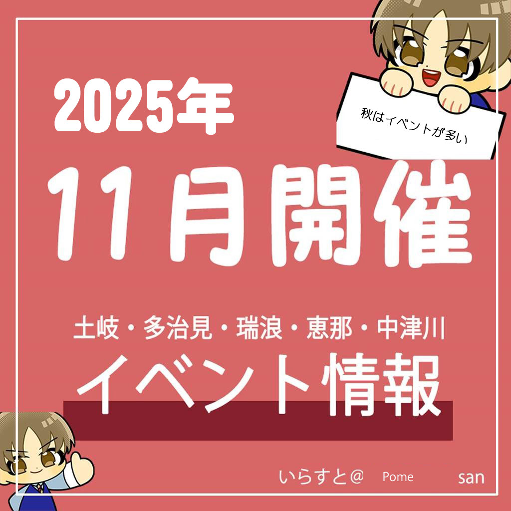 HOMEブログイベント情報 【2025年11月】岐阜県 東濃5市のイベント情報まとめ(随時更新予定) 2025.10.15 イベント情報 目次 [ open close ] 東濃5市のイベント(随時更新予定) 東濃5市のイベント(随時更新予定) ※画面キャプチャによる転載等、何卒ご容赦ください。(掲載拒否などございましたらご連絡ください) ほか開催情報について変更などがある場合があります、最新情報、正誤に関しては開催元に直接確認ください。 【2025新店情報 秋】 土岐、瑞浪、多治見だけでも、こんなに沢山の新店舗がオープンする予定です!