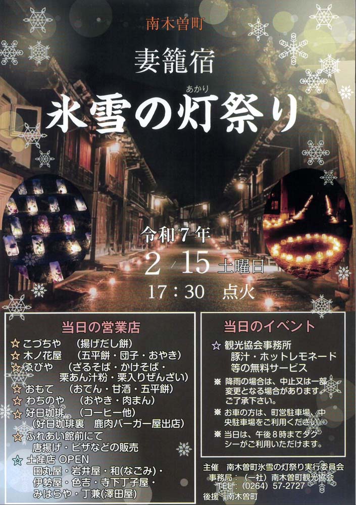 以下は、昨年のスケジュールですが、1月下旬から2月中旬に渡り、木曽路を巡る各地で開催されます。